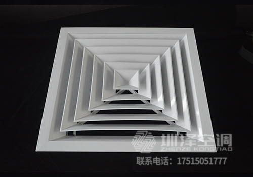 方形散流器先調挺直,表面光潔,葉片角度為固定式,葉片采用夾角片沖壓連接,整個葉片與邊框采用分離式結構,以方便安裝與調節。設計時可根據房間造型不同,選用不同出風方向的散流器,可與調節閥配套使用。方形散流器有四種氣流吹出形式,分別為一面吹(A1SO)、二面吹(A2SO)、三面吹(A3SO)、四面吹(A4SO)。鋁合金表面經陽極氧化處理,也可根據用戶要求進行靜電噴塑處理。